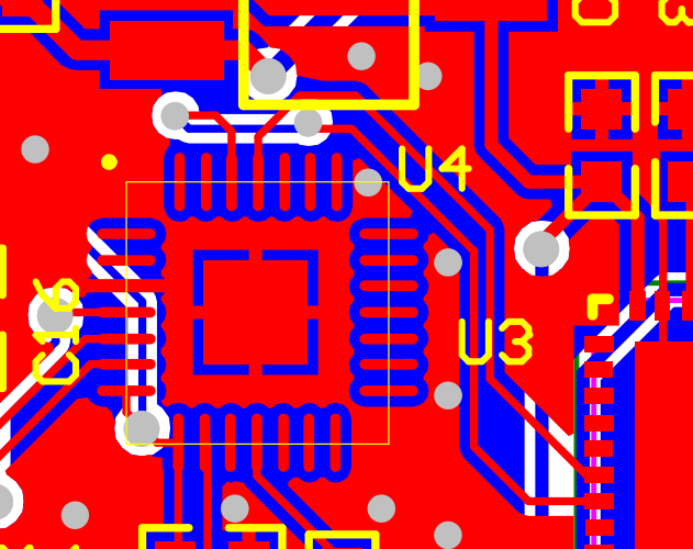 实际上这样是非常危险的做法,一旦覆盖这根线的阻焊层脱落,由于QFN封装底部会有一个方形的散热用的pad,这个pad一般是接地的,此时若在这个pad与裸露的走线接触,就会造成这跟信号线对地短路,造成不可预料的问题,图中那根线恰好是UART的RX线,因此会造成单片机能发送但收不到UART数据,不要认为这个是多虑,在实际焊接当中,我确实碰到了因为阻焊层脱落而短路的这个问题,因此最后改成下图这样: